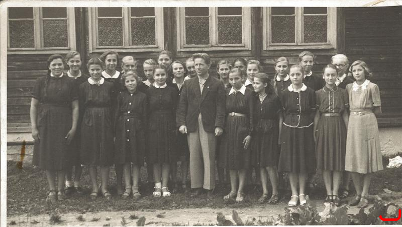 Dyrektor LO ze swoimi wychowankami na tle internatu 1956r.
