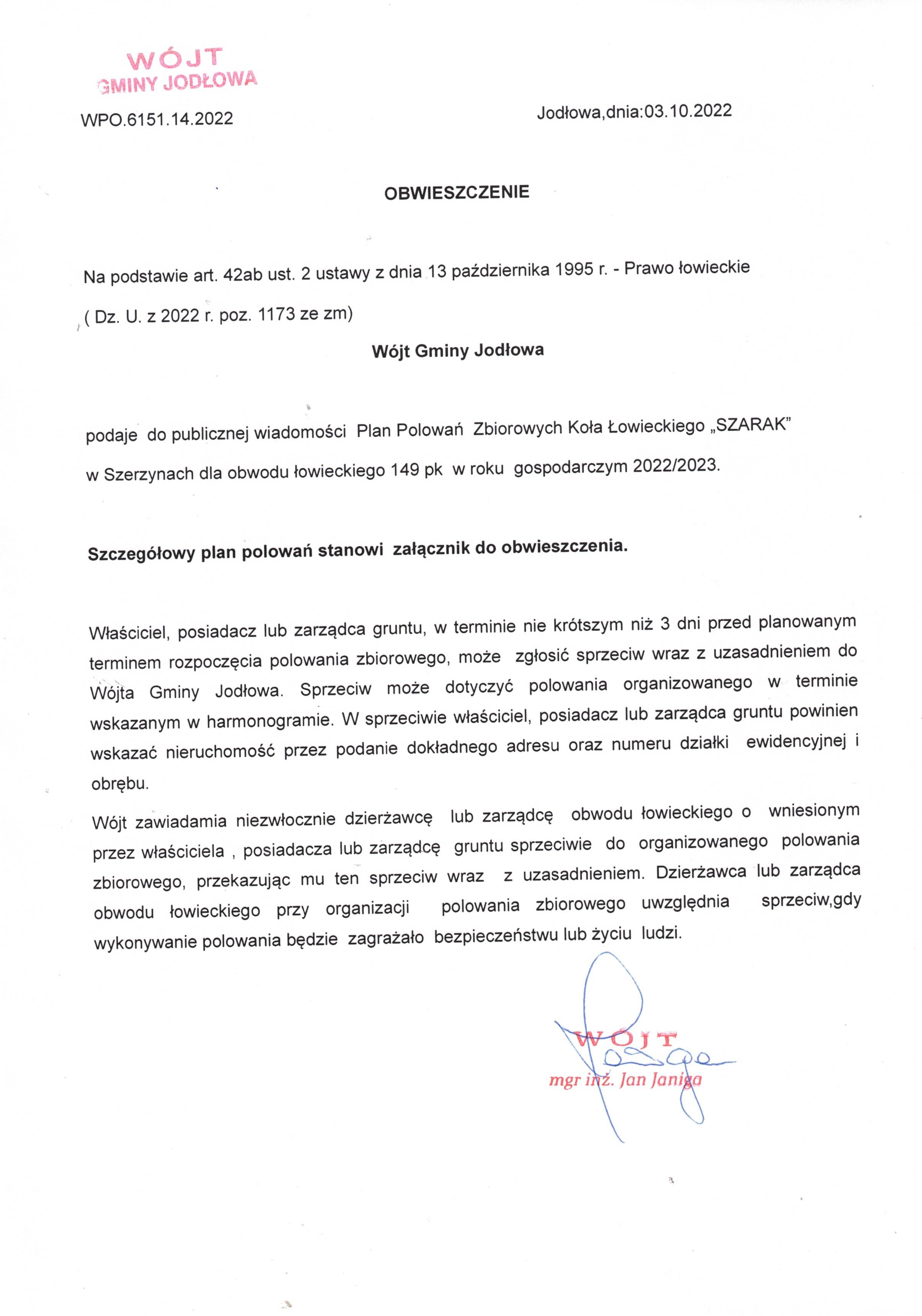 Obwieszczenie Wójta Gminy Jodłowa z 03.10.2022r.o Planach Polowań Koła Łowieckiego SZARAK